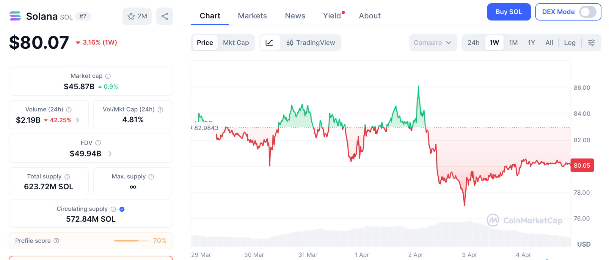 Data from CoinMarketCap shows SOL holding steady at $80.07, with support at $72. While a move above $85 could lead to $100, a failure to hold support could see it drop toward $60.