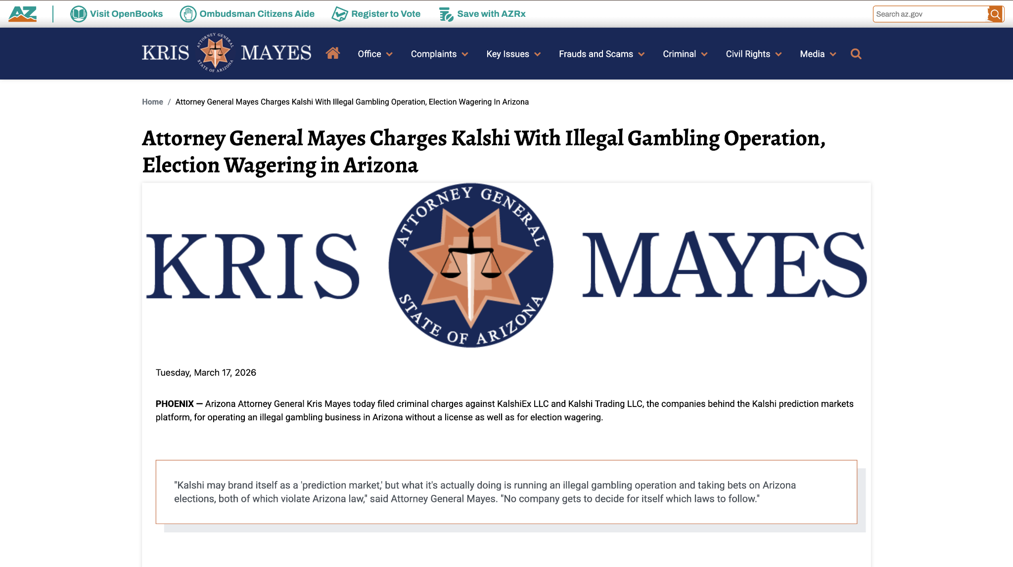 Tarek Mansour, co-founder and CEO of Kalshi, is currently disputing criminal charges brought by Arizona Attorney General Kris Mayes. The Attorney General publicly accused the prediction market platform of operating an unlicensed, illegal gambling business and facilitating unlawful election wagering for state residents.