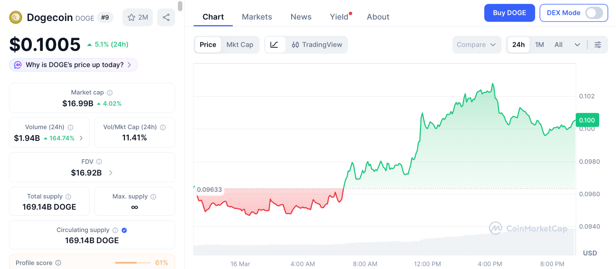 DOGE is trading at $0.1005 on March 16, CoinMarketCap data shows, floating just above a crucial support threshold. On-chain data indicates large wallets are decreasing their positions. Short positions are increasing. Recent sessions saw over $5 million in long position liquidations.