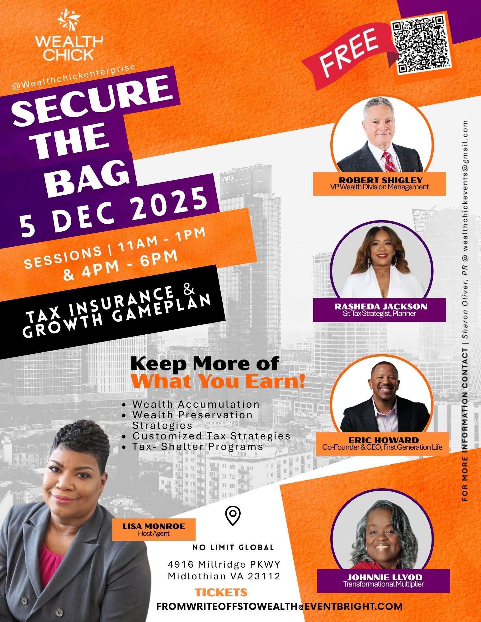 Midlothian, Virginia – December 19, 2025 – Wealth Chick Enterprise is pleased to announce “Secure the Bag,” a no-cost financial literacy and wealth-building event scheduled for December 5, 2025, at No Limit Global, located at 4916 Millridge Parkway, Midlothian, VA 23112. Two engaging sessions will be available from 11 AM-1 PM and 4 PM-6 PM, offering flexible attendance options for participants.